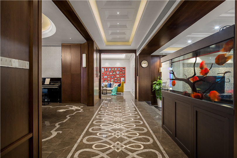 寬敞而狹長的大廳從南至北貫穿整個房屋,設計師在這個超大空間大膽采用了咖色地磚,升華著整體的環境的格調。同樣色系的拼花將它一分為二,一邊是餐廚區,一邊是客廳,這條自然形成的走廊便可直達偏廳(起居室),所有臥室都集中在這一部分,形成動靜分區的自然過渡。