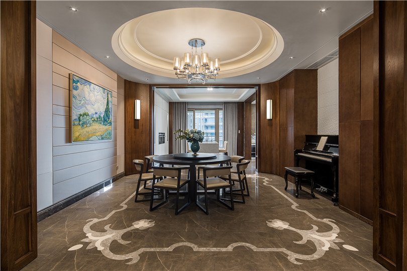 餐廳延續客廳的設計,橡木與硬包的結合,圓型的吊頂與餐桌上下呼應,家中唯一的一盞大吊燈使餐廳更加敞亮,并賦予了高朋滿座時的歡愉熱鬧。