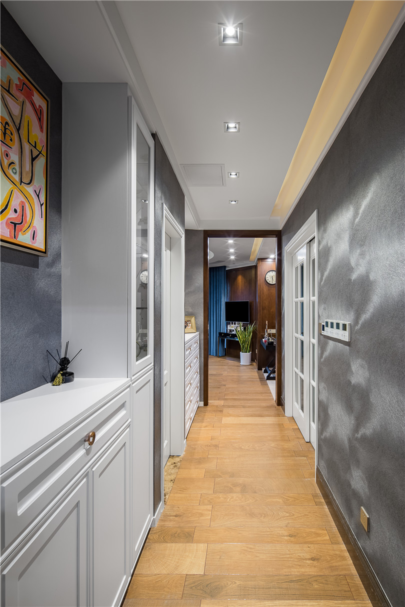 進入主套的走廊采用高級灰帶來更多理性的氣息,配以超現實主義畫家保羅克利的掛畫,更顯示房主不俗的藝術修養。