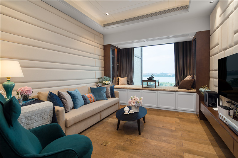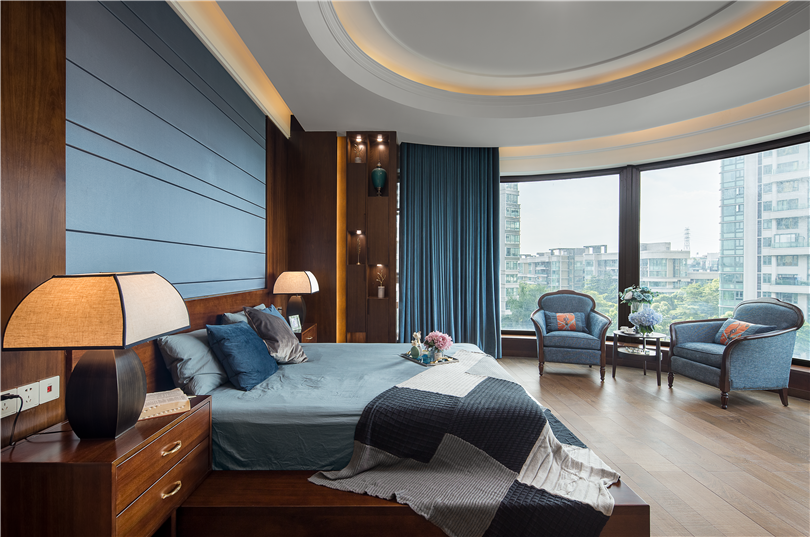270°落地窗是主臥的亮點,搭配藍色天鵝絨的窗簾,無論白天還是夜晚,這里都時時透露著典雅與時尚。